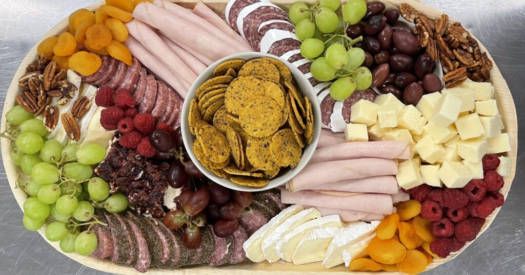 Available only at our Canoe Museum location, a display of cured meat, farmers sausage, various cheeses, olives, fresh berries, dried fruit along with GF crackers.